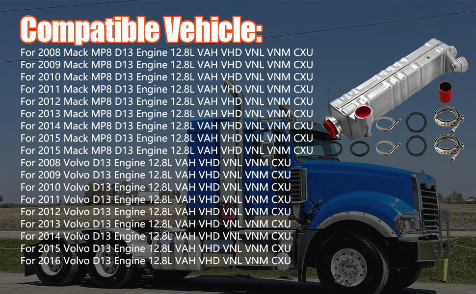 EGR Cooler with Hose and Clamps for 2008-2016 Mack MP8 D13, for 2008-2016 Volvo D13 Engine 12.8L - 85136428