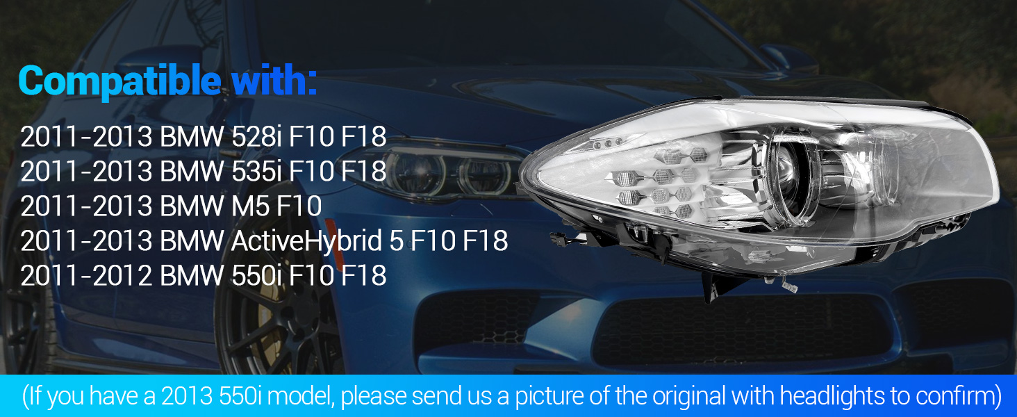 (If you have a 2013 550i model, please send us a picture of the original with headlights to confirm)