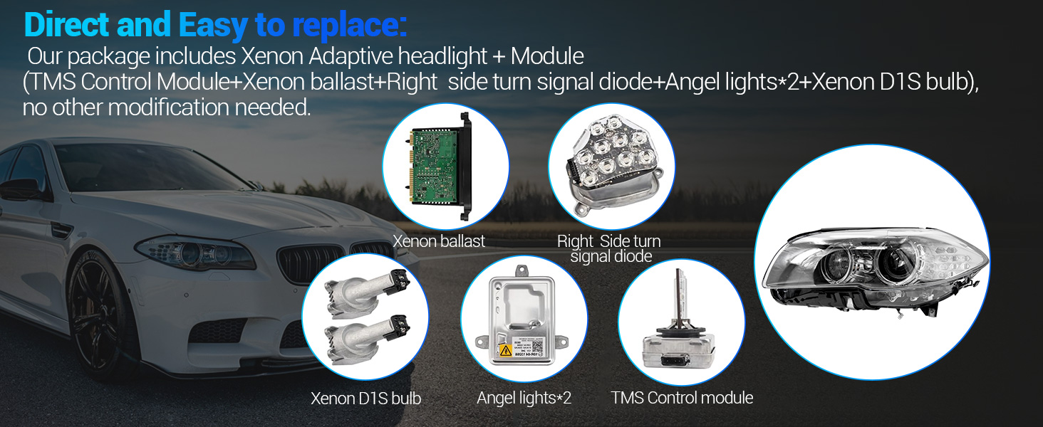 Our package includes Xenon Adaptive headlight + Module (TMS Control Module+Xenon ballast+Left side turn signal diode+Angel lights*2+Xenon D1S bulb), no other modification needed.